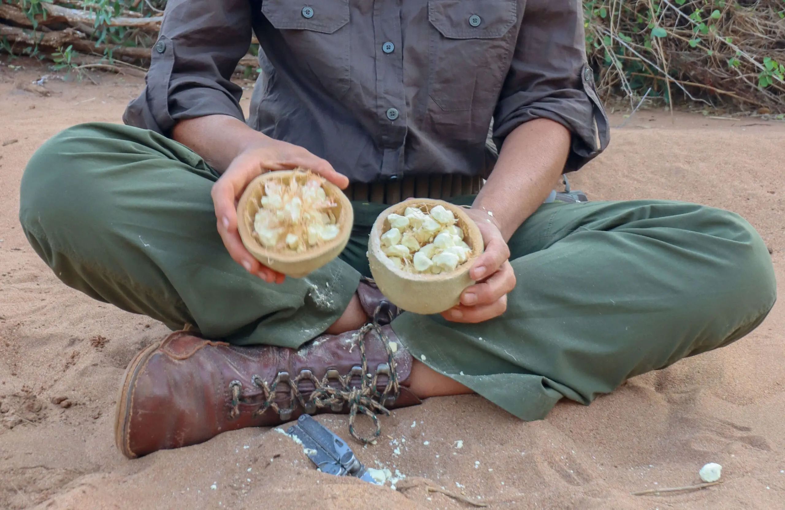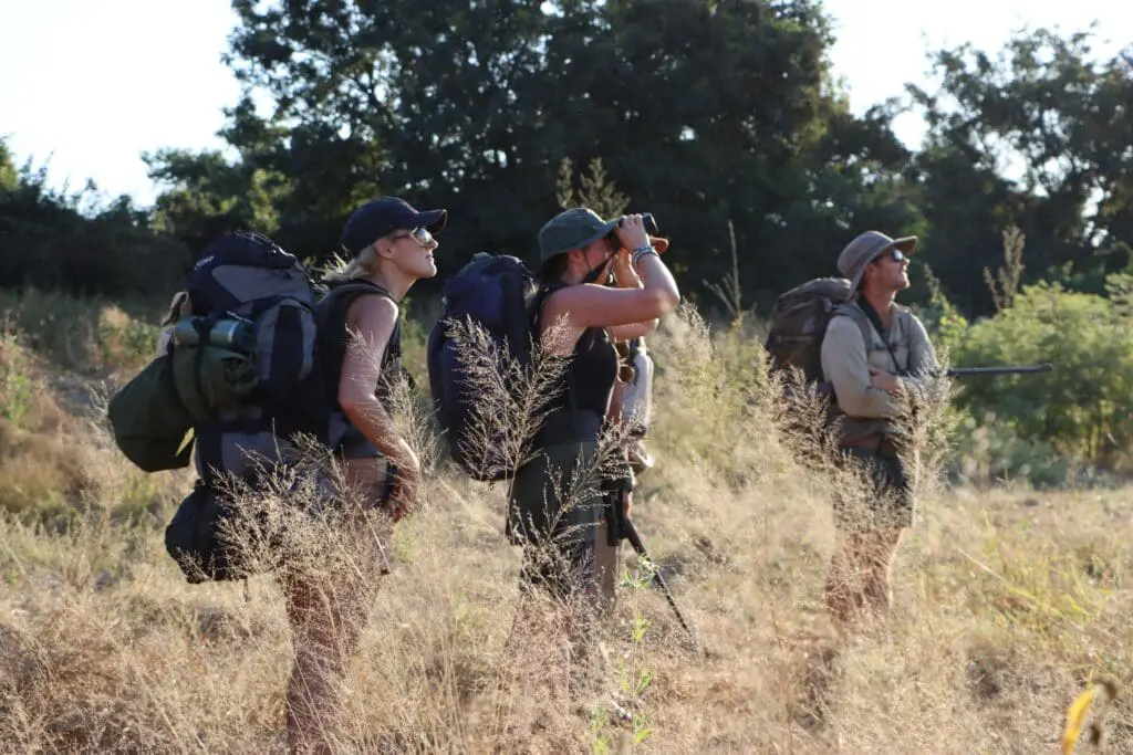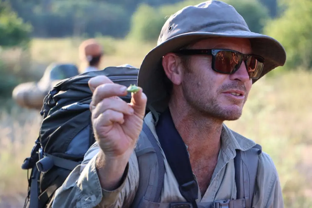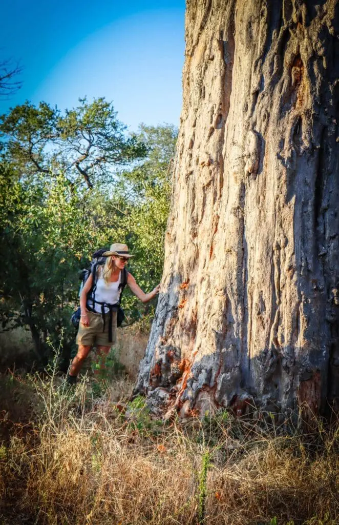My fellow hikers had similar experiences. Some found the trail physically challenging. The distances aren’t long, but the terrain requires moderate fitness. For others, night watch was deeply unsettling. For others still, it was hard to feel vulnerable and exposed with people who’d started the walk as strangers. By the third morning though, we were infused with energy as though confronted with our own vulnerabilities, we’d found an unexpected strength. We bonded over the citrusy scent of the crushed leaves of a hairy knobwood Zanthoxylum humile, known as the gin-and-tonic bush, laughed at some (loudly) orgasmic baboons, and marvelled at a heap of fibres that had once been a baobab.